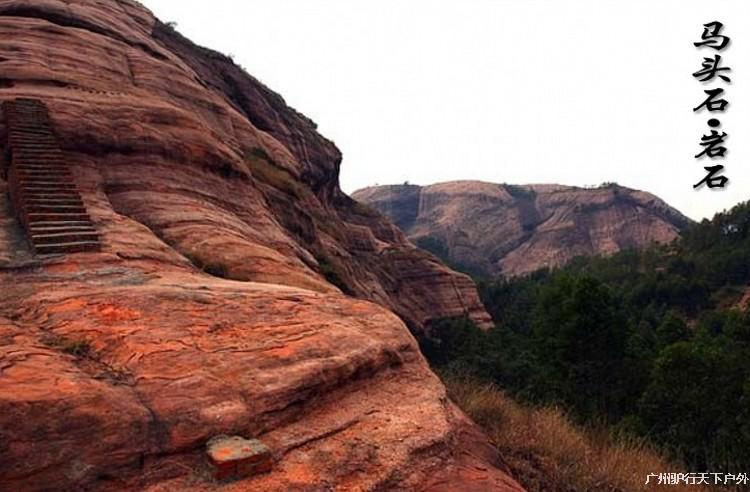 13:30 登马头石风景区,马头石为丹霞地貌最高峰,雄伟壮观,似一匹匍匐的骏马。景区内除了拥有雄险奇秀的丹崖赤壁外,还有绿树葱葱、流水行云,构成一幅幅青山、绿水、红岩的雄险画卷,令人陶醉,流连忘返。