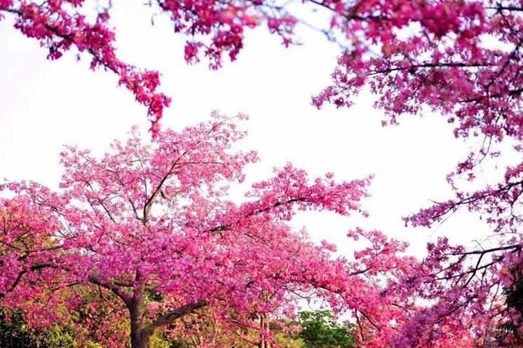 美丽异木棉,又称美人树、大腹异木棉、丝绵树、酩酊树,花期长达三个月,冬季到初春开花。开花时满树鲜艳的花朵,绚丽耀目,异常美丽。