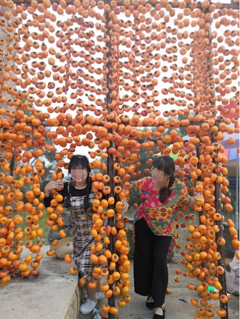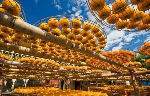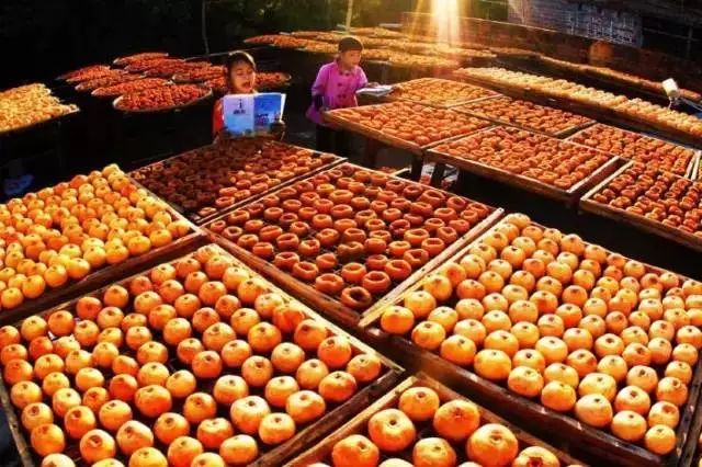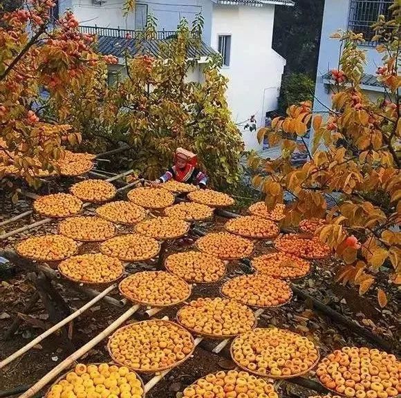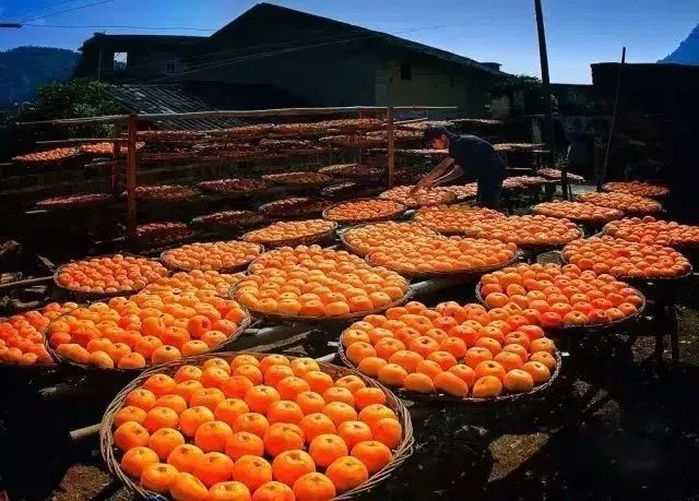 走进红岩村,房前屋后都是柿子,树上挂着的、院子里铺着的、装着的、吊着的,一排排一列列,整整齐齐地享受着秋日的阳光,构成一幅浓郁的金色油画。