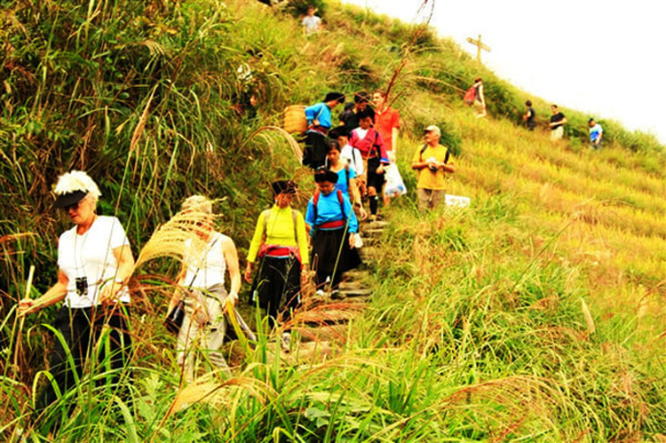15:30 乘坐观光车直达平安寨九龙五虎梯田,村寨最大特点是其建筑相当古朴,历史久远,有几处甚至有上百年的历史,且保持相当完好。走路有上坡约30分钟,观光车10分钟,观光车费自理,30元单程,50往返。