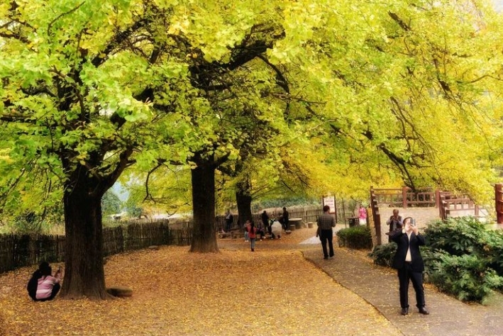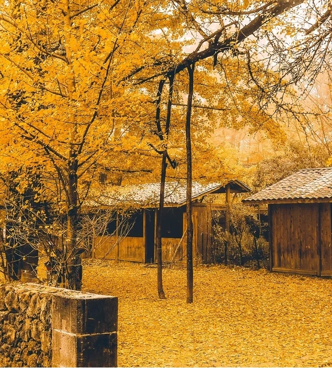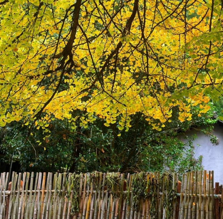 有人说,一个把黄色都用尽了的小村庄,是个浪漫的地方!能想到的最浪漫的事,就是坐在这里的摇椅上,和你看着漫天飞舞的金黄,慢慢地摇;想做的最浪漫的事之一,就是被你牵着手,旁若无人地走在金色堆砌的魔毯上,留下只属于我们的“银杏树之恋”!