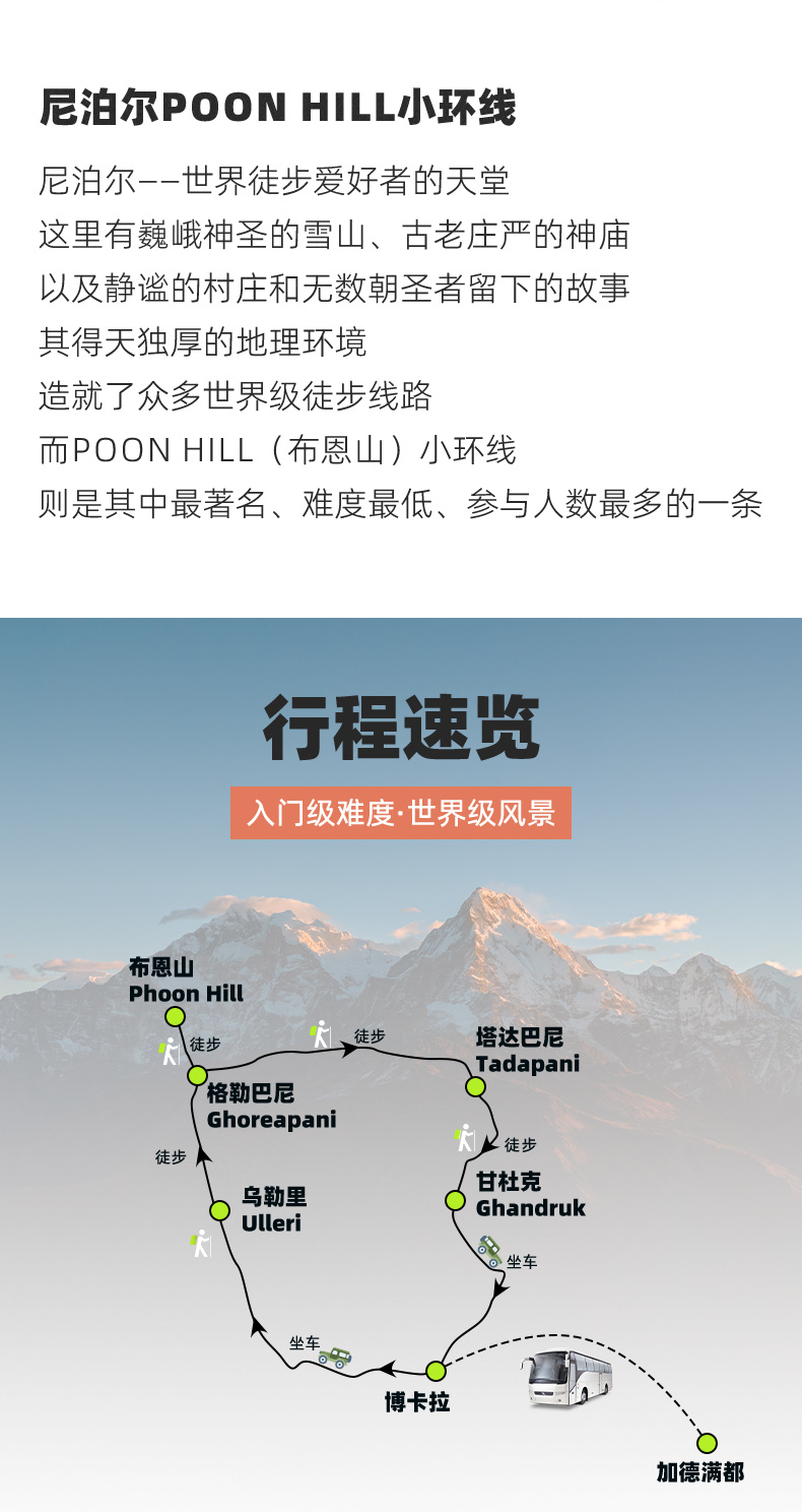 【行程概述】早餐过后我们会乘坐越野车去徒步起点乌勒里Ulleri1960m,乘坐越野车大概需要4.5小时,然后会在乌勒里感受一下山间的魅力。从乌勒里Ulleri1960m开始,徒步时间约为6小时左右,徒步距离8公里,爬升1000米。这段路程基本以上坡路和台阶为主(建议使用登山杖),沿途可见田野、村庄和雪山(安娜普尔娜南峰-7200m,道拉吉里峰-8167m等,鱼尾峰-6993m,其中鱼尾峰尼泊尔人心目中的神山,至今仍是处女峰。)晚上入住观景客栈,运气好可以拍到美丽的银河星轨。Ghorepani在尼泊尔语中Ghore是马的意思,pani是水的意思,所以Ghorepani是马喝水的地方,在过去是尼泊尔与西藏往来盐贸易的地方。