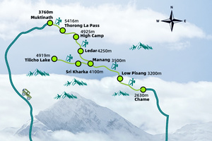 Thorong-La垭口附近风大寒冷,需穿戴防风保暖装备,下山路段陡峭,需注意防滑。