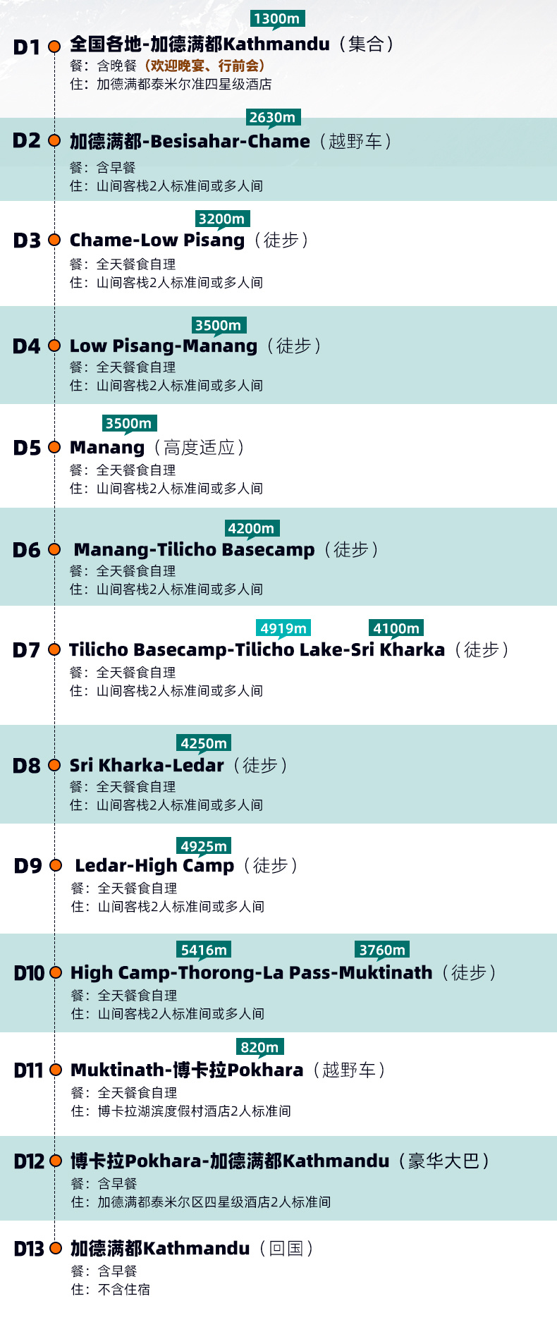 (2)今日行程较为艰苦,需提前准备好第二天的轻装行李,为攀登 Thorong-La Pass 做重要准备。