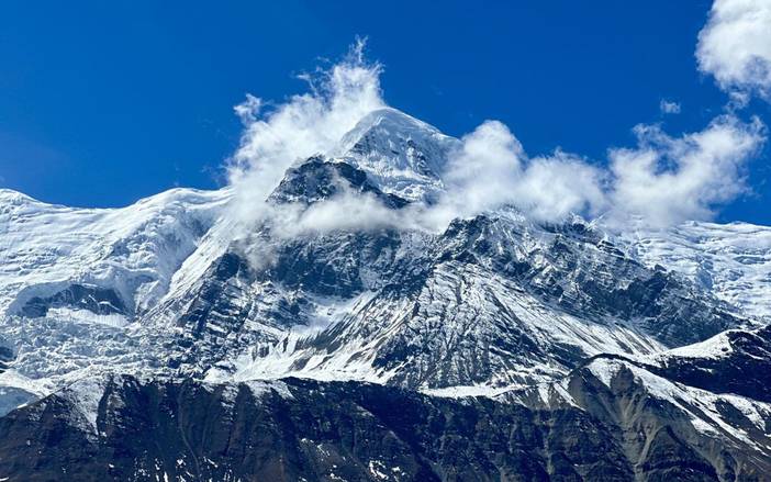 【行程概述】从Low Pisang出发,穿越干旱河谷,一路丛林茂盛,抵达Manang,全程约17公里,耗时7小时。今日将进入干旱河谷地带,地形变得开阔,马杨迪河(Marsyangdi)在荒原上切割出深邃峡谷。岗嘎普尔纳(Gangapurna)雪山(7454m)倒映在湖泊中,形成壮观画面。Manang是ACT路线上的重要城镇,曾是古代商道上的重要驿站。这里保留着传统的藏族文化,村内的古老寺庙和玛尼堆诉说着过往的历史。