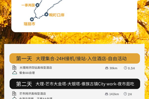 银杏季11-12月份行程:早餐后前往固东镇银杏村,约1小时抵达景区,随后进入银杏村进行疯狂摄影创作。这里,是宛如天堂的静谧秋景;这里,是电影《武侠》的拍摄地;这里,是秋季里的金色梦想;这里村在林中,林在村中相互依托。这里,便是天下第一银杏王国《腾冲银杏村》。游人身临其境,仿若走进金色的童话世界。午餐特大家可以AA品尝当地特色农家乐【银杏宴】,但需提前预订哟。