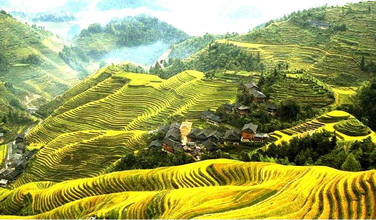 龙脊梯田的景色随季节的更替而变幻无穷,四季如画。开春之际,灌满水的层层梯田映衬天光,如根根银带相叠;夏日,绿油油的禾苗随风翻卷出道道绿波;金秋时节,漫山铺金,层层梯田若级级金阶,梯田环绕的山峰又似座座金塔;隆冬,银装素裹,把梯田和山寨都嵌入冰雕玉砌的童话世界。