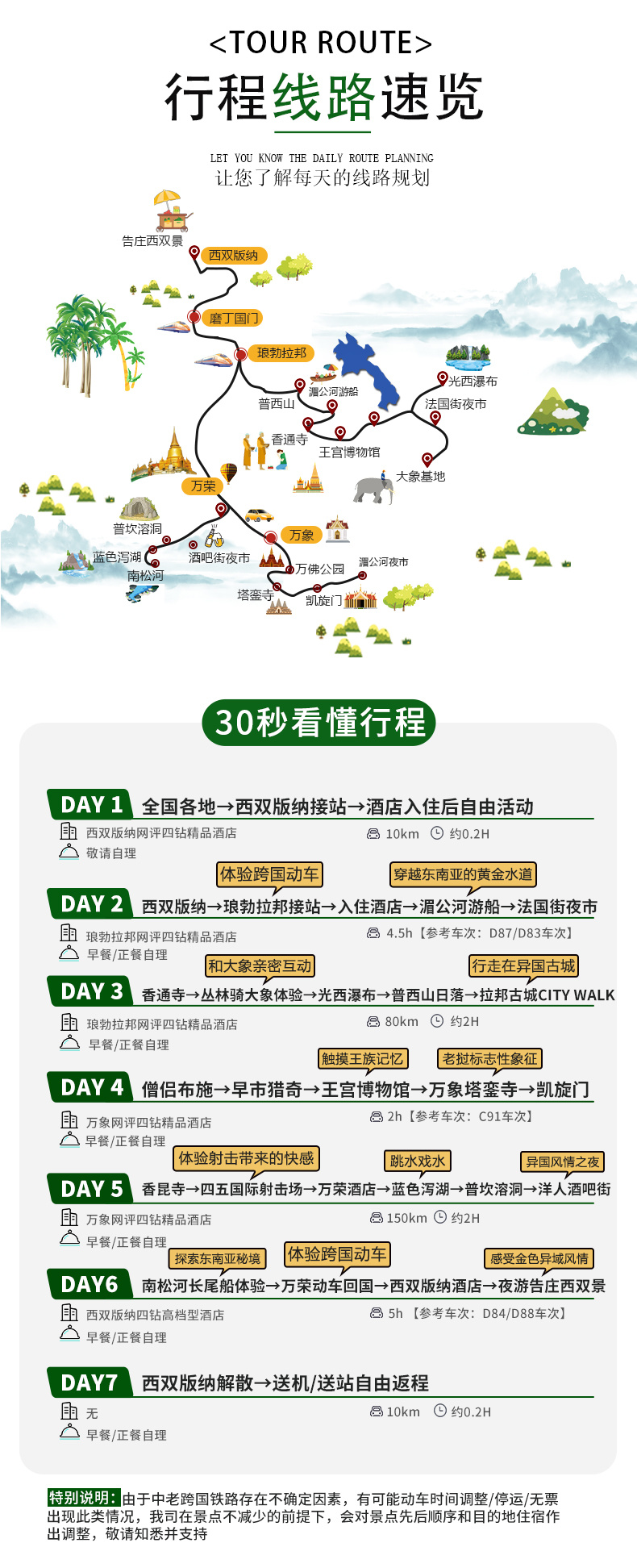 温馨提示:由于中老跨国铁路存在不确定因素,有可能动车时间调整/停运/无票,出现此类情况,我司在景点不减少的前提下,会对景点先后顺序和目的地住宿作出调整,敬请知悉并支持。