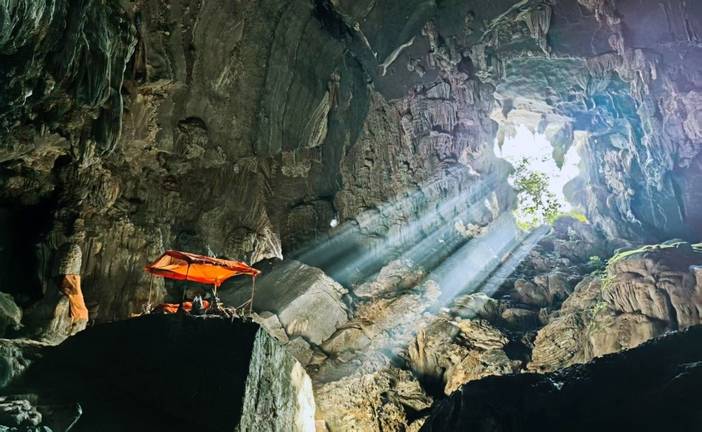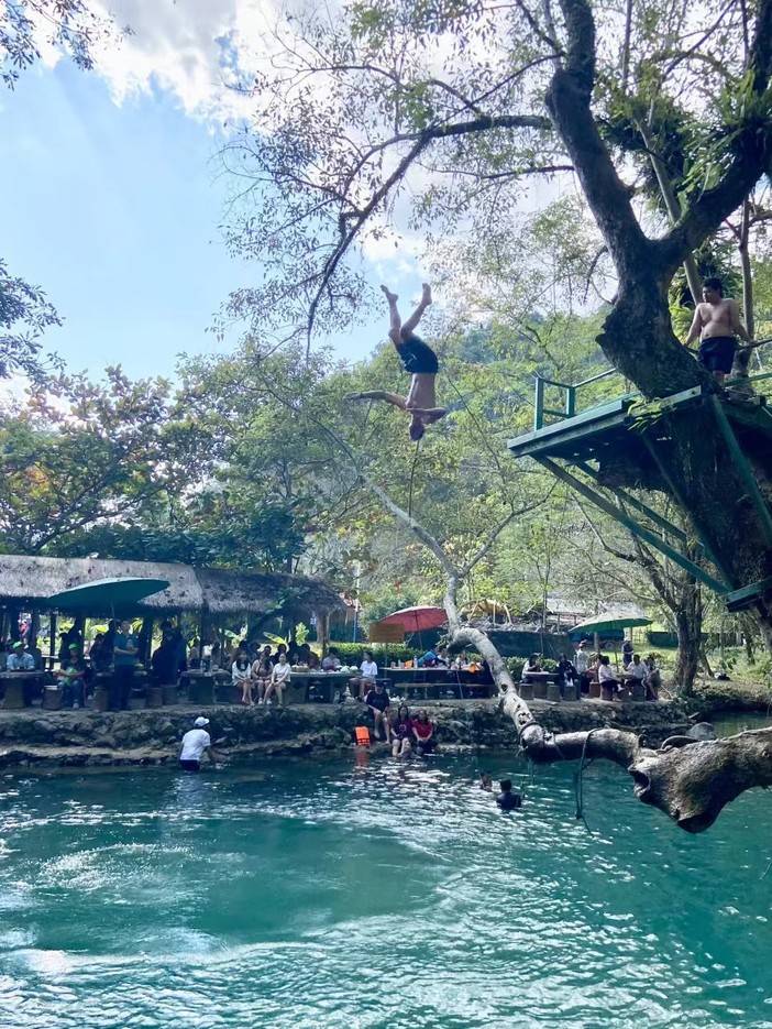 参观完【四五国际射击场】乘车前往老挝户外天堂【万荣】,车程2小时后抵达万荣酒店办理入住。稍作休息后前往万荣【蓝色泻湖】,是游客必须打卡的地方,水质非常好,里面有许多鱼儿游弋。泻湖实在耀眼,世界各地游客争相到此,游客站在5米高树枝跳台上往下跳,是到这里游玩的主要项目,跳入蓝色的湖水中享受清凉,更可仰望帅哥穿越高空滑索;蓝色泻湖往上步行一百米便是【普坎溶洞】,是万荣负盛名的岩洞,巨大的溶洞神秘而又原生态;主洞里供奉着一尊青铜卧佛,在阳光照射在主洞室内呈现出丁达尔效应,备受外国游客的青睐。
