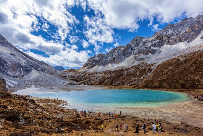从洛绒牛场徙步约3小时抵达圣湖【牛奶海】,往返约10公里,湛蓝色的牛奶海形同蓝色地球的眼泪点缀于雪山群峰中,从牛奶海的右侧再上行约一百米,便到达此次徙步的最高点【五色海】,五色海在阳光的折射下呈现出五彩斑澜的奇幻景象,据说心诚的人,可以在这里看到自己的未来。