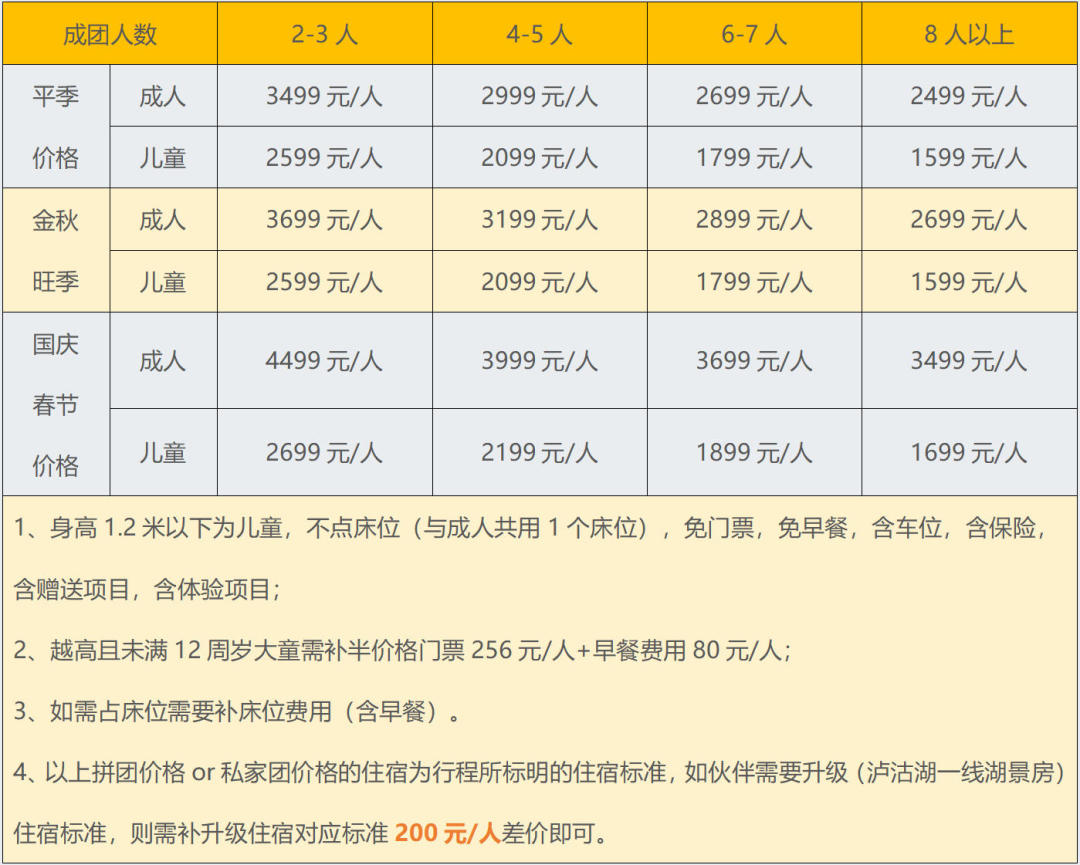 ▷房差:自然拼房2-3人标准间,如不愿拼房或拼不了房者须补单房差(平季600元/人,金秋旺季800元/人,国庆1200元/人);