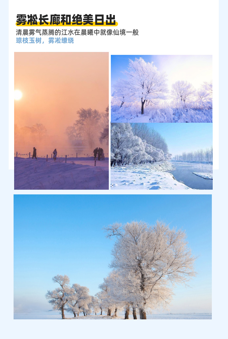 备注:【寒地冬捕】【雪上飞龙】【泼水成冰】等雪上活动12月中旬冰面封冻体验;如不能玩冰上活动会替换成朝鲜族民俗村。