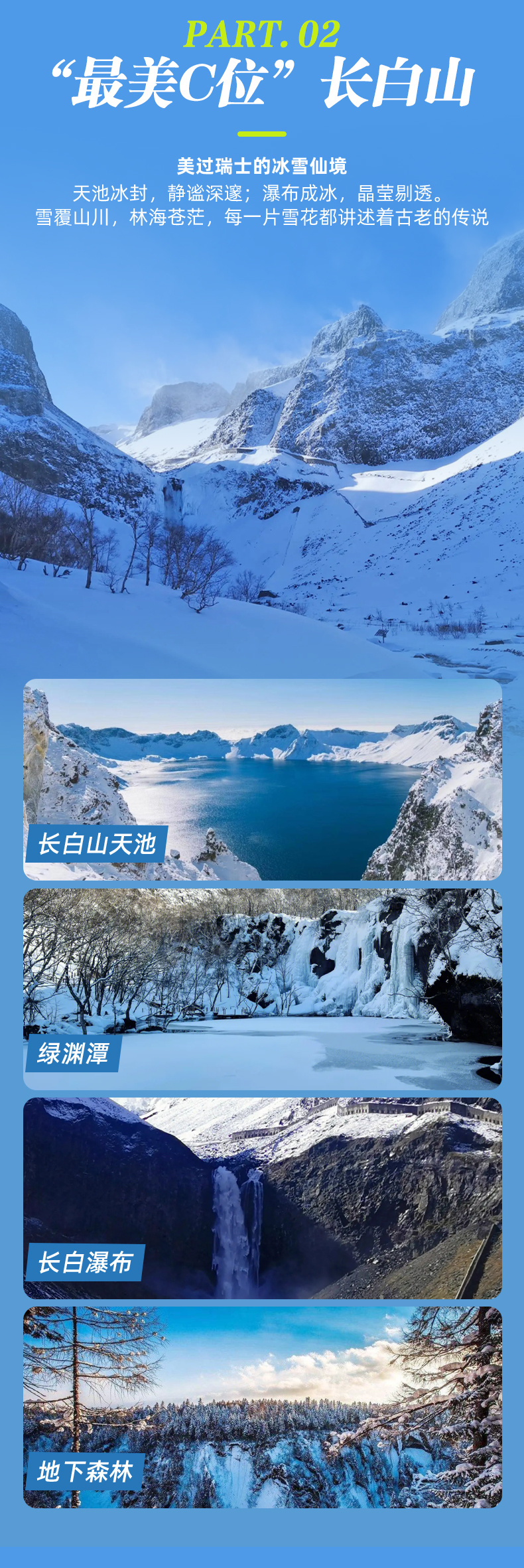 早餐后,我们向着"东北屋脊"【长白山】进发。传说中,长相守、到白头的誓言在这里最是灵验。乘坐景交车盘旋而上,72道弯每一转都是不一样的冰雪画卷,仿佛在为我们缓缓揭开圣山神秘的面纱。