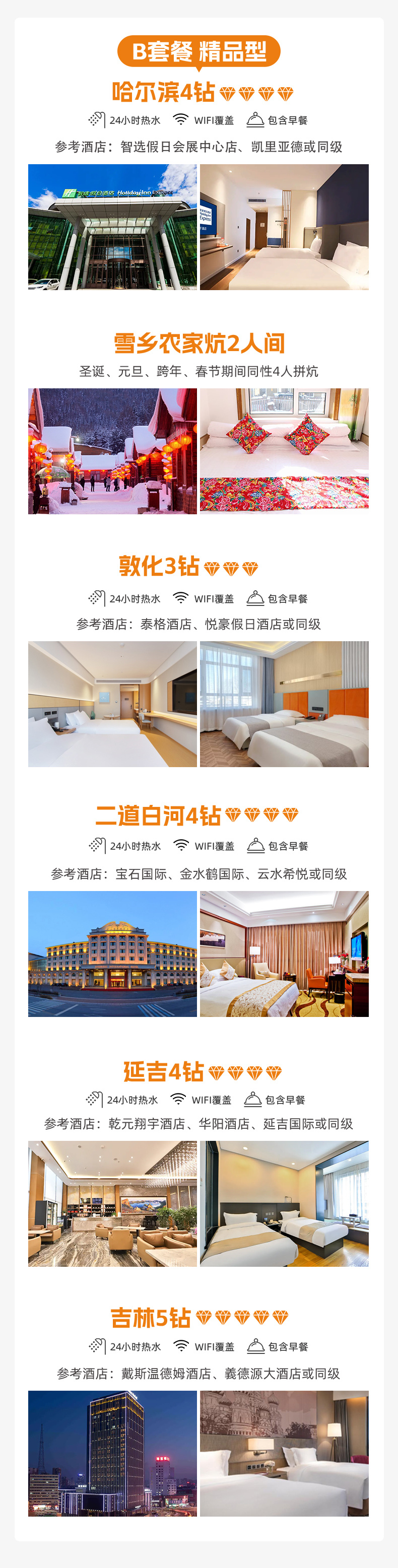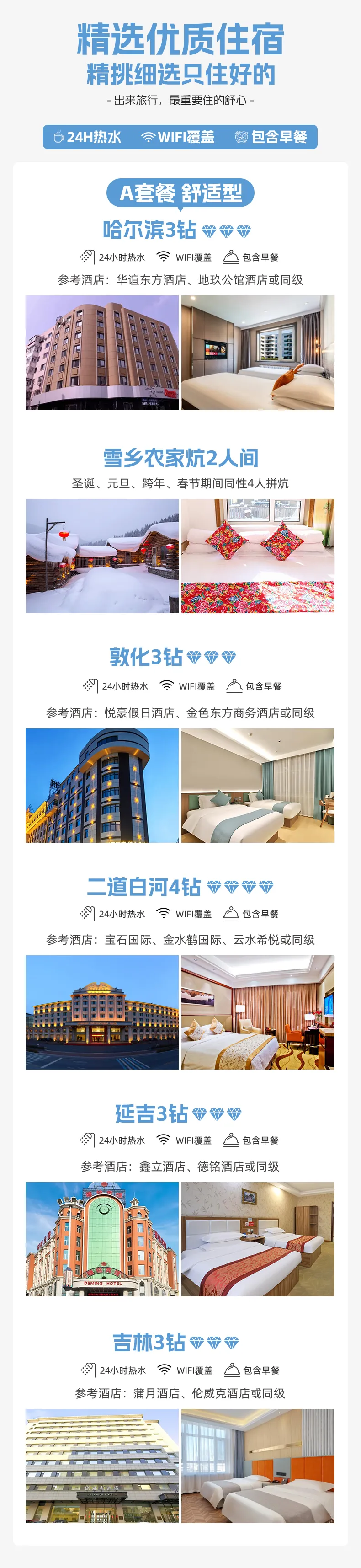 备注:酒店钻级参考标准:3钻为当地舒适型酒店、4钻为当地高档型酒店,5钻为当地豪华型酒店,东北经济发展较南方相对落后,与大城市同级别酒店略差,敬请见谅