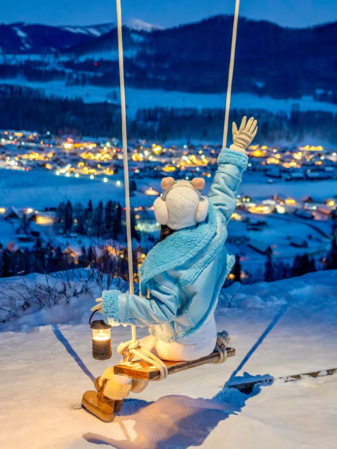 今日冬恋双湖8日之旅正式开启!早起乘车出发,沿着新疆首条沙漠高速公路——S21阿乌高速,一路向北穿越古尔班通古特沙漠。冬季的公路两旁,沙漠被白雪覆盖,形成 “雪裹黄沙” 的独特景观,途中在克拉美丽沙漠公园停留拍照。抵达雪都阿勒泰后前往将军山,坐着缆车上山,随着海拔升高,城市灯光像打翻的星河在脚下铺开,当夕阳跌进阿尔泰山的怀抱,粉橘色天际线从雪道尽头晕染整座雪场化作流动的金色油画,听着耳边动感的音乐,人世间的浪漫莫过于此。后前往酒店入住。