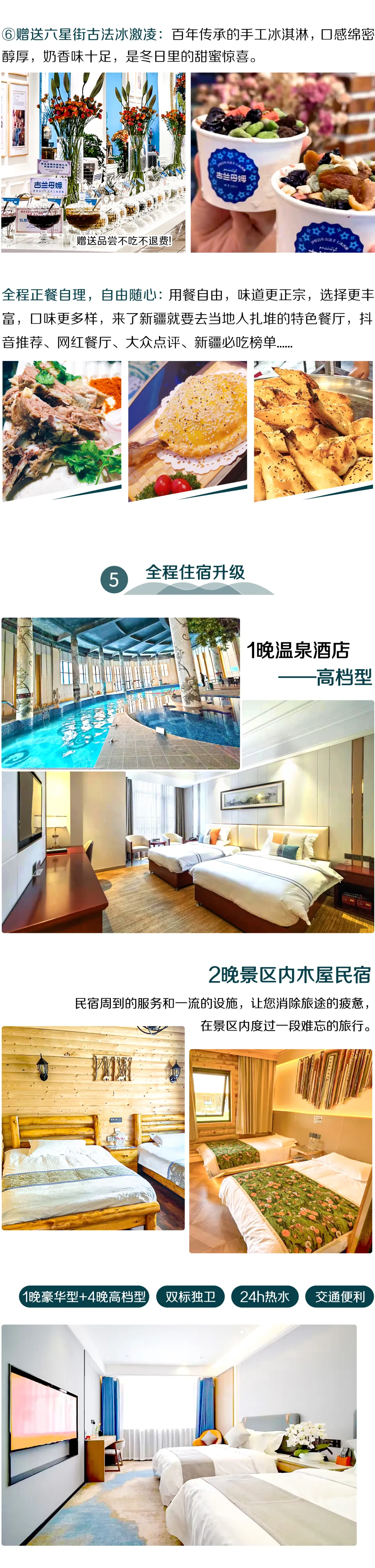 5.如遇大雪封山,无法前往禾木,则行程变更为DAY3:阿勒泰—白哈巴,住白哈巴木屋民宿,DAY4:白哈巴—喀纳斯湖+三湾—禾木,住禾木木屋民宿,DAY5:禾木—吉克普林滑雪—胡杨林(落日)-乌尔禾黄金盛宴,住乌尔禾高档型酒店标间,费用不变;由于冬季仅售卖喀白禾套票,由不可抗力造成的喀纳斯+禾木+白哈巴部分景点或赠送项目无法按原计划执行的,无退费,敬请谅解。