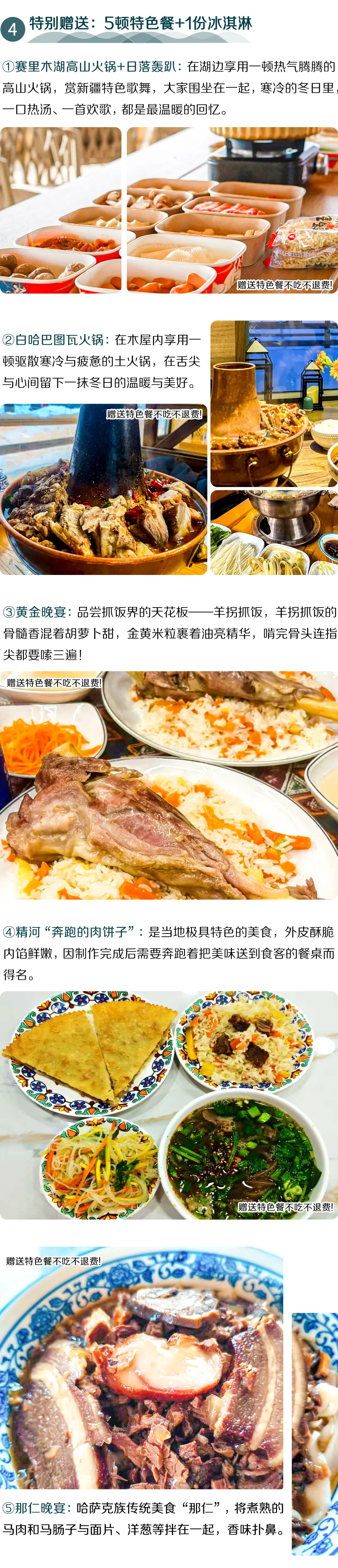 7.白哈巴图瓦火锅晚宴为赠送项目,如因天气等不可抗力无法前往白哈巴,不吃不退,敬请谅解。