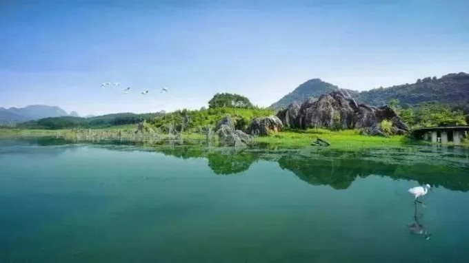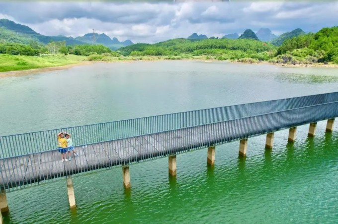 10:00 到达同心岛情人桥,跟着领队一起,沿着情人桥走进一片神秘的世界,湖水清澈如镜,四周碧草如茵,来个两公里休闲徒步拍照,大口吸氧;