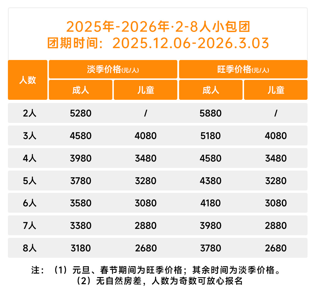 7、 住房说明:产生住宿的活动中,如出现单男单女,尽量安排该客人与同性别团友拼房;如男女一起报名的,如不能同住一间房的,需在报名时备注栏内备注清楚;如不愿拼房,请补齐单房差以享用单人房间。如单人报名要求住一个房间的,需致电客服确认是否能安排,单房差自理。