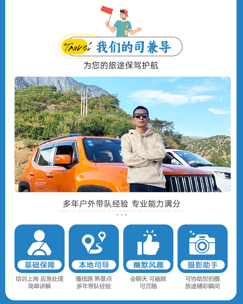 6、领队:司机兼向导(司机仅提供向导、代办住宿等服务;无法像专业领队一样提供讲解、景区伴游等服务!)