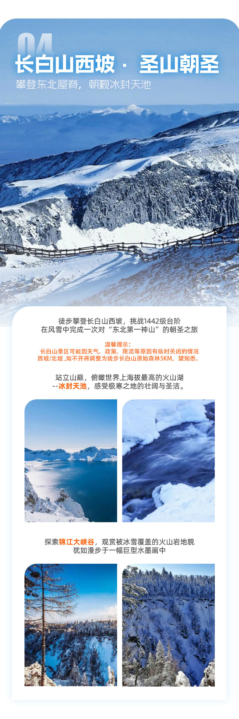 长白山西坡台阶冬季可能封闭,若无法登顶天池,将调整为其他景点。