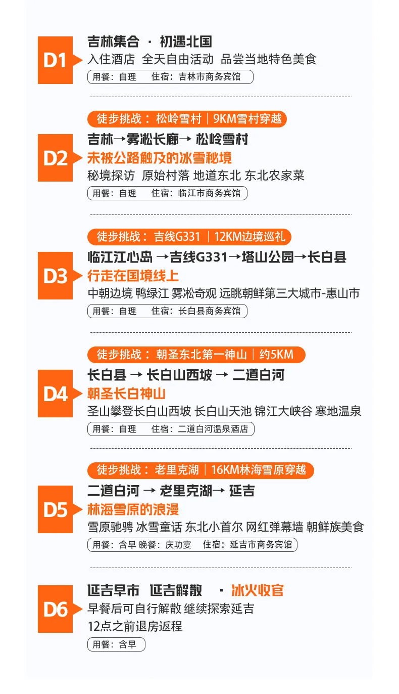 长白山景区由于冬季旅游人数较多、景区限流、提前15天预约等因素,团队参观时间严格执行预约时间游览,景点参观顺序按照预约时间进行调整,如未能预约到长白山景区门票或当天临时闭园,我司将调整徒步穿越“长白山原始森林5KM”(门票及车程相抵扣无差价退还)