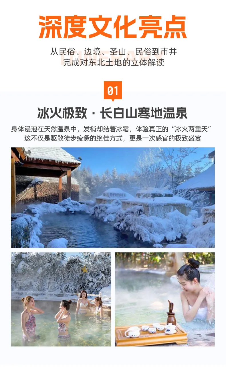 乘车前往长白山下的枢纽小镇——【二道白河镇】入住。我们为您安排的是当地的温泉酒店。结束一天的徒步辛劳,没有比泡一场温泉更极致的享受了。在零下的室外环境中,将身体浸入热气蒸腾的硫磺泉,体验“冰火两重天”的独特快感,让温润的泉水洗去所有疲惫。