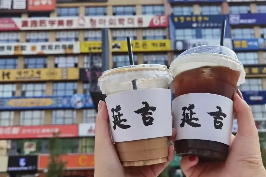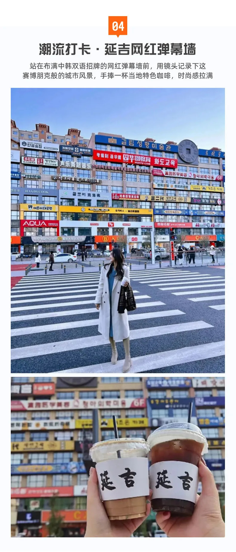 在【网红弹幕墙】打卡;在延大对面【文创街区】,手持"延吉"字样咖啡杯(推荐后浪咖啡、茶伊娜等网红店铺),以布满中韩双语的招牌墙为背景,拍摄专属纪念照。