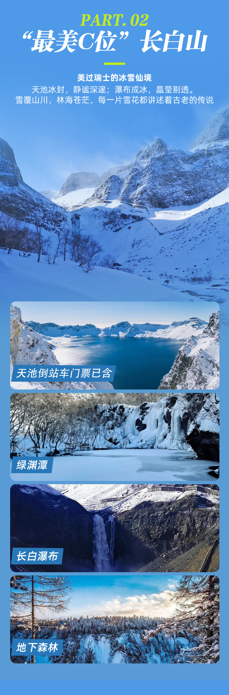 1、长白山北景区由于冬季旅游人数较多、景区限流、提前15天预约等因素,团队参观时间严格执行预约时间游览,景点参观顺序按照预约时间进行调整,如未能预约到长白山北景区全门票,我司将调整游览“长白山雪岭景区”(门票及车程相抵扣无差价退还)