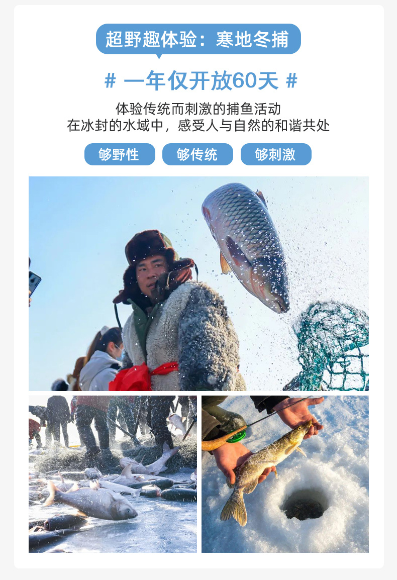 2.冬捕收获随缘,请保持平常心,体验过程更重要,镜泊湖冬捕以及雪圈长龙12月15号以后冰面结冰期安排,如届时不开将替换成朝鲜族民俗园