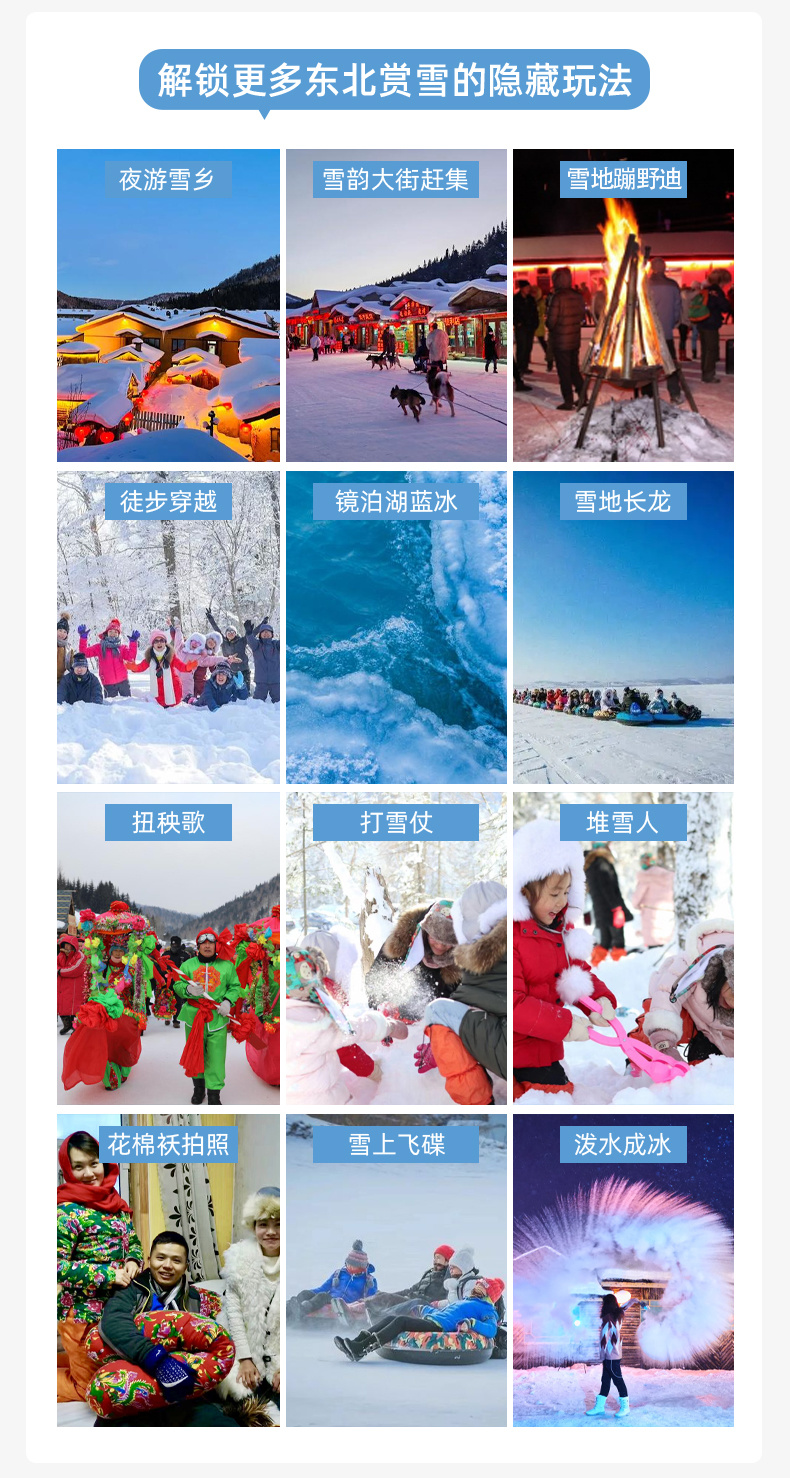 备注:马拉爬犁、雪地摩托、镜泊湖冬捕,每年12月下旬至2月下旬冰面厚度达到安全标准后赠送;赠送项目因天气、交通、政策等非人为原因或游客自身原因不体验,导致赠送项目无法赠送体验的,不退费。
