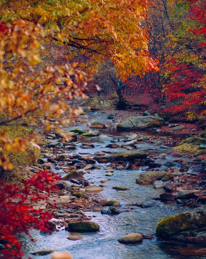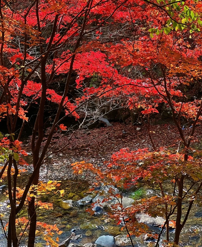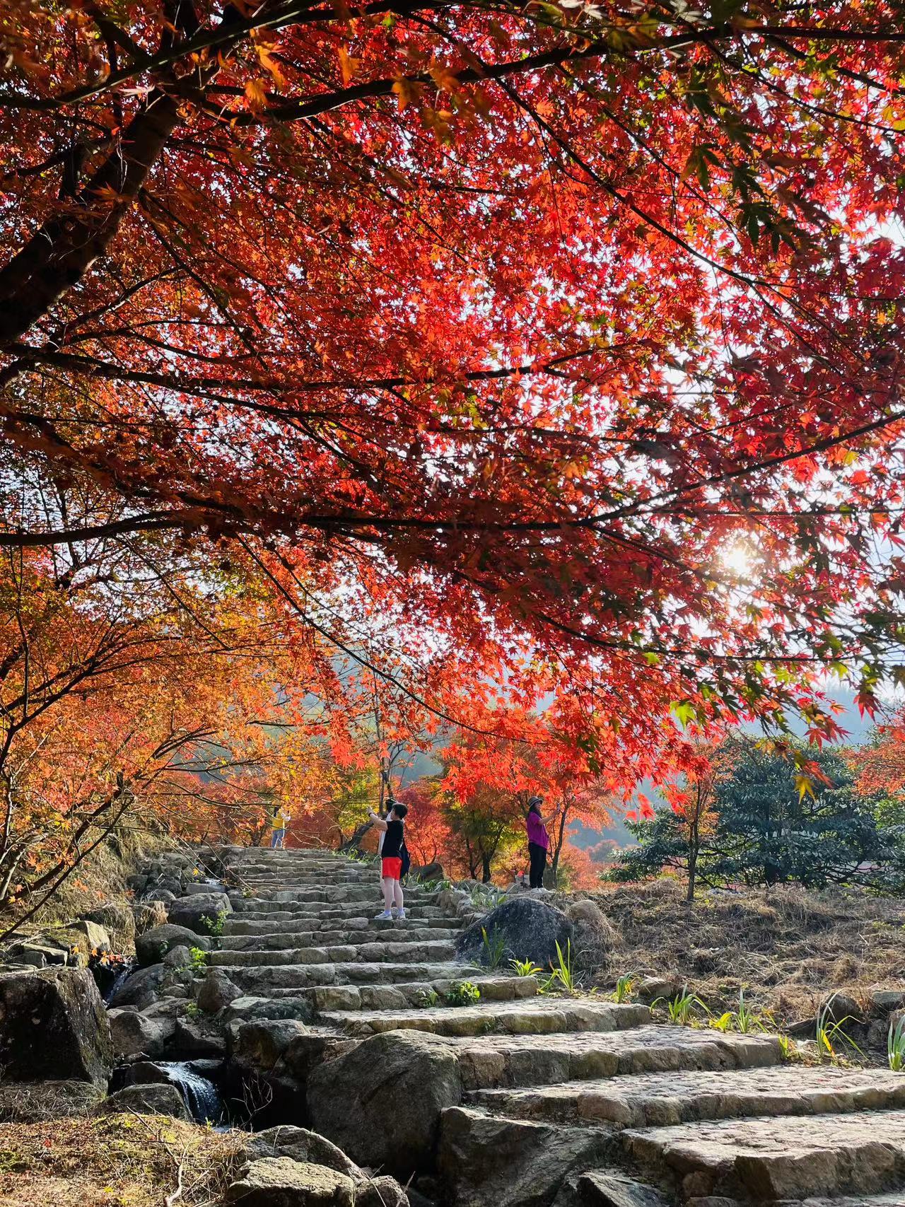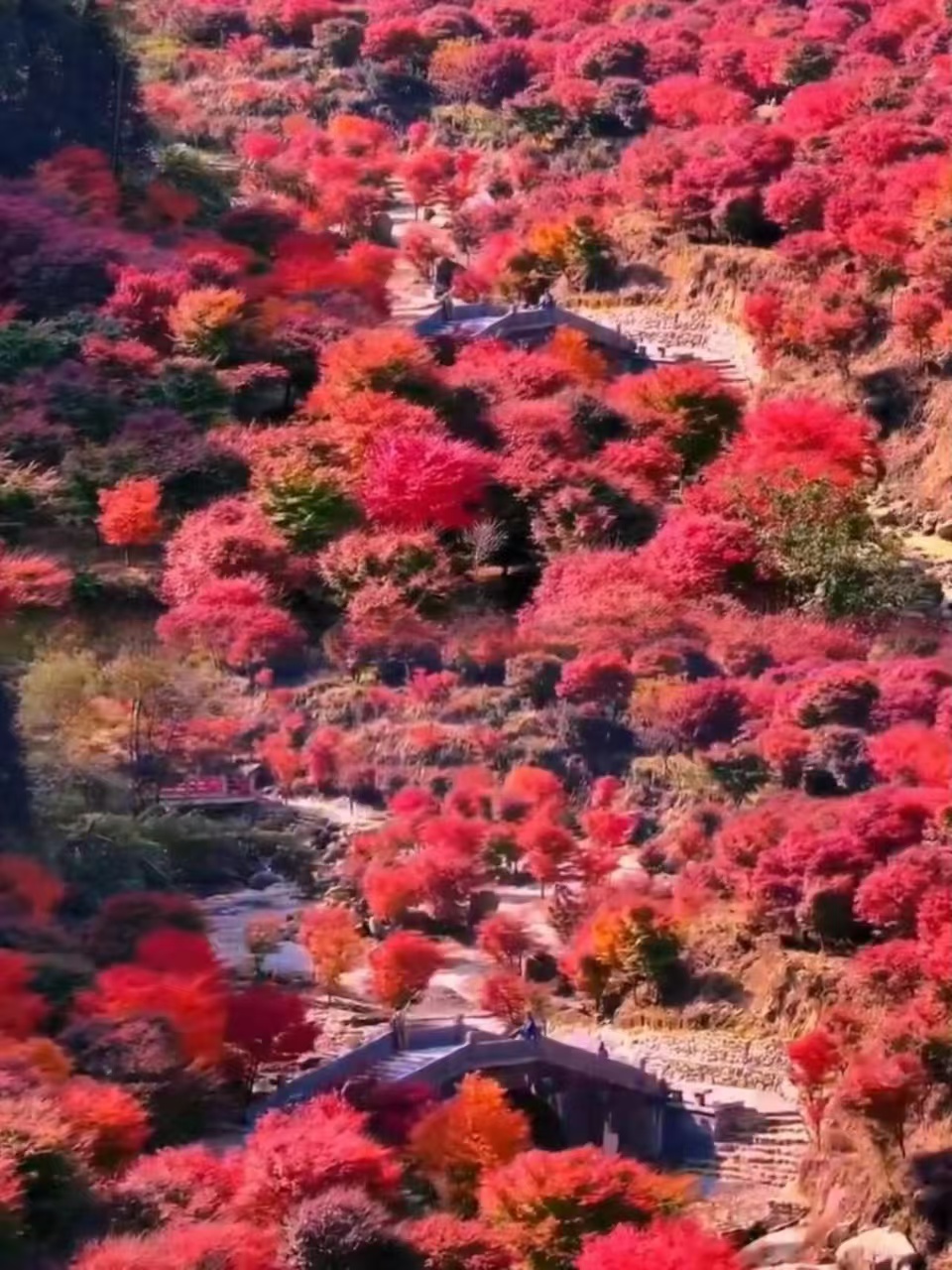 12:30 到达【十里枫叶林】,抬眼望去,层层叠叠的枫叶红得浓烈,红得似火,染红了山谷,染红了山涧,就像一条鲜红的地毯铺在蜿蜒曲折的山谷中,美轮美奂,美不胜收。