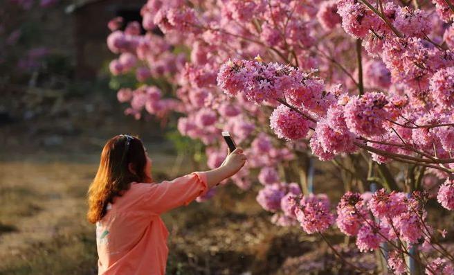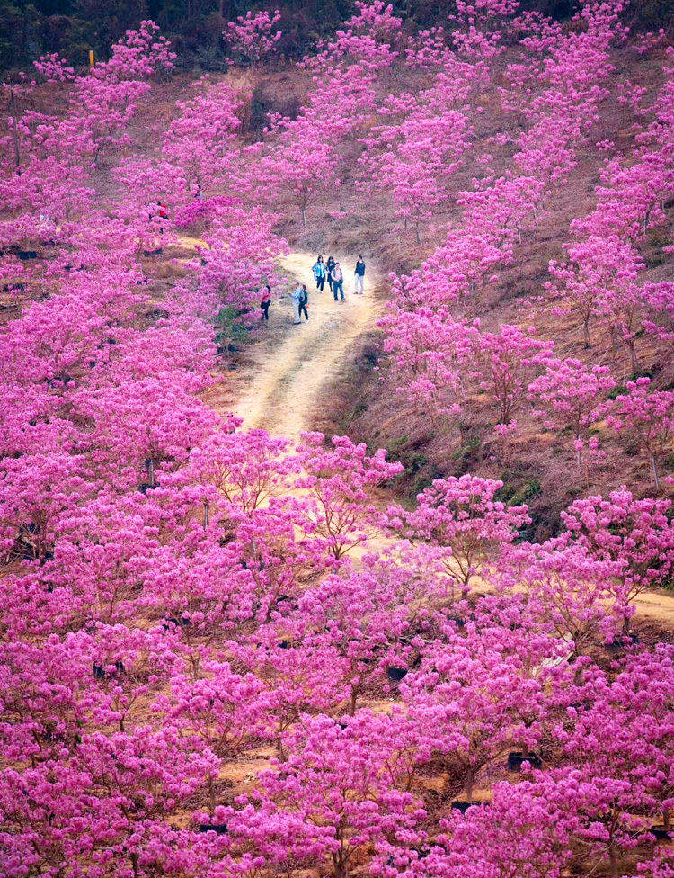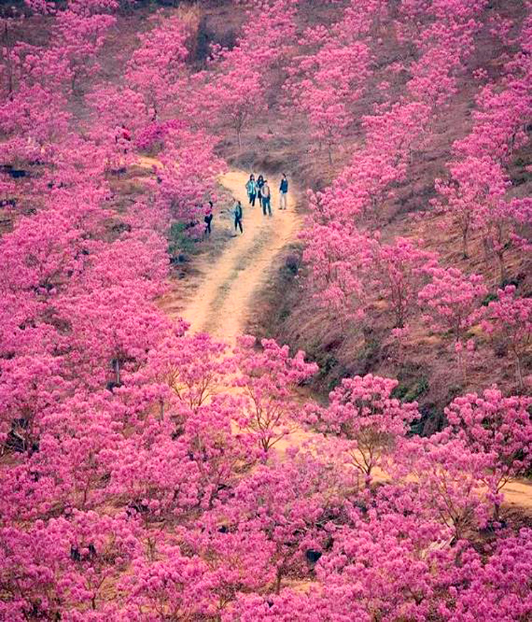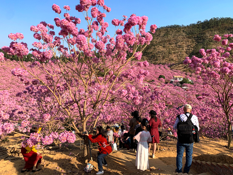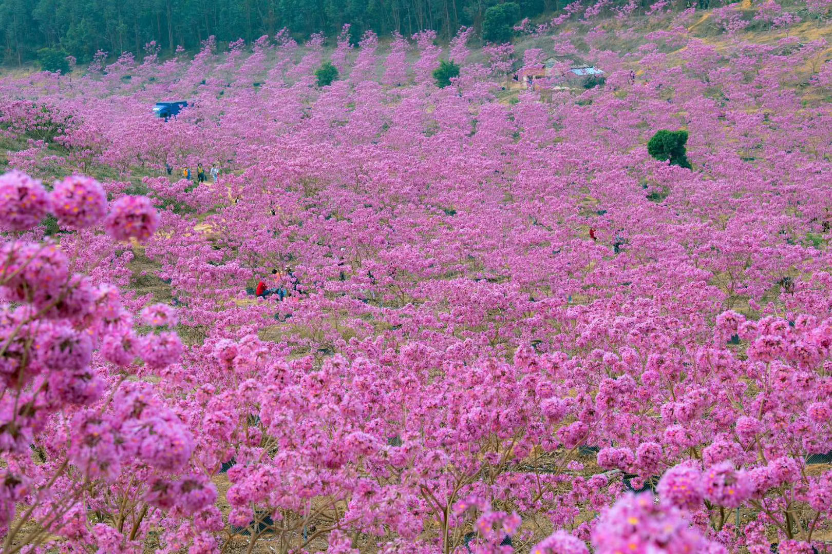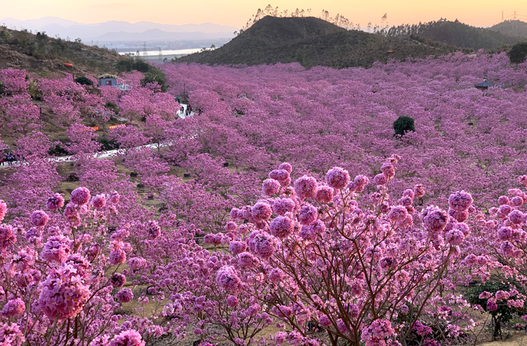 14:50 到达【绿美生态园】,占地千余亩的紫花风铃木林场,每逢冬季,这里的风铃花争相怒放,浪漫花海开满山头,形成一片姹紫嫣红的海洋