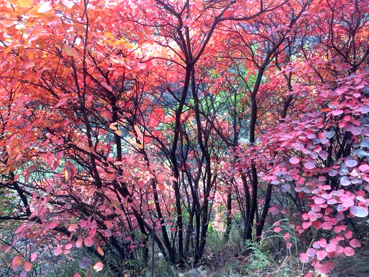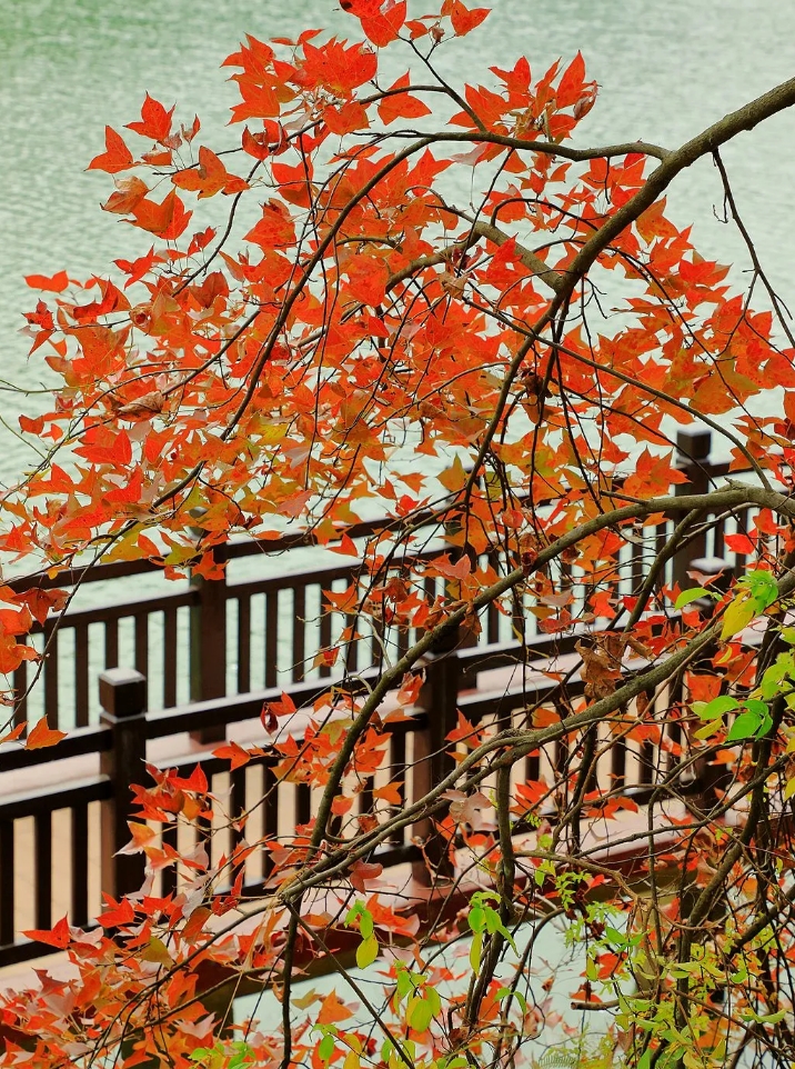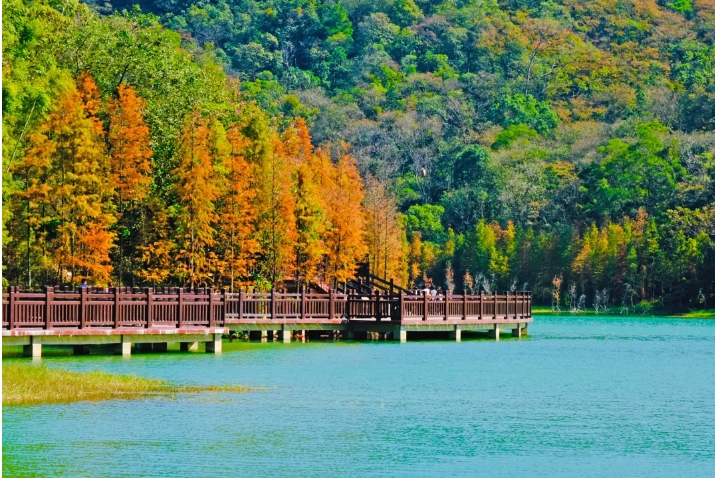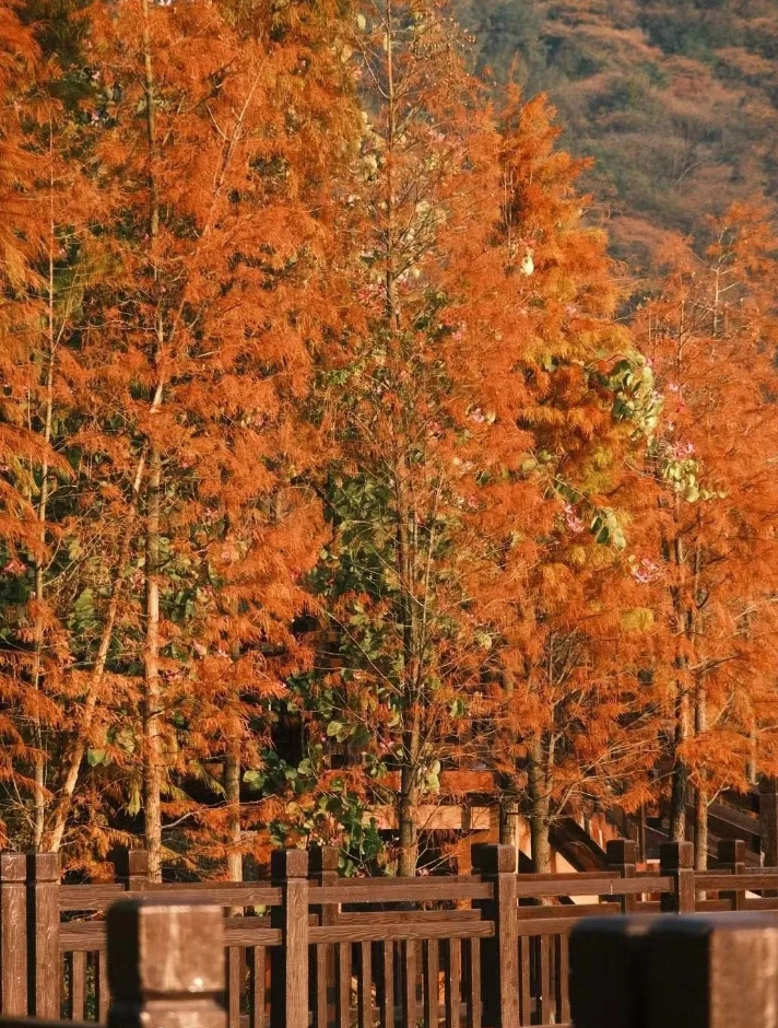 12:50 到达【石涧公园】,漫游小环线,挺拔的落羽杉披上了红装,宛如童话世界。漫步在水杉林亲水栈,享受小九寨的多彩风光