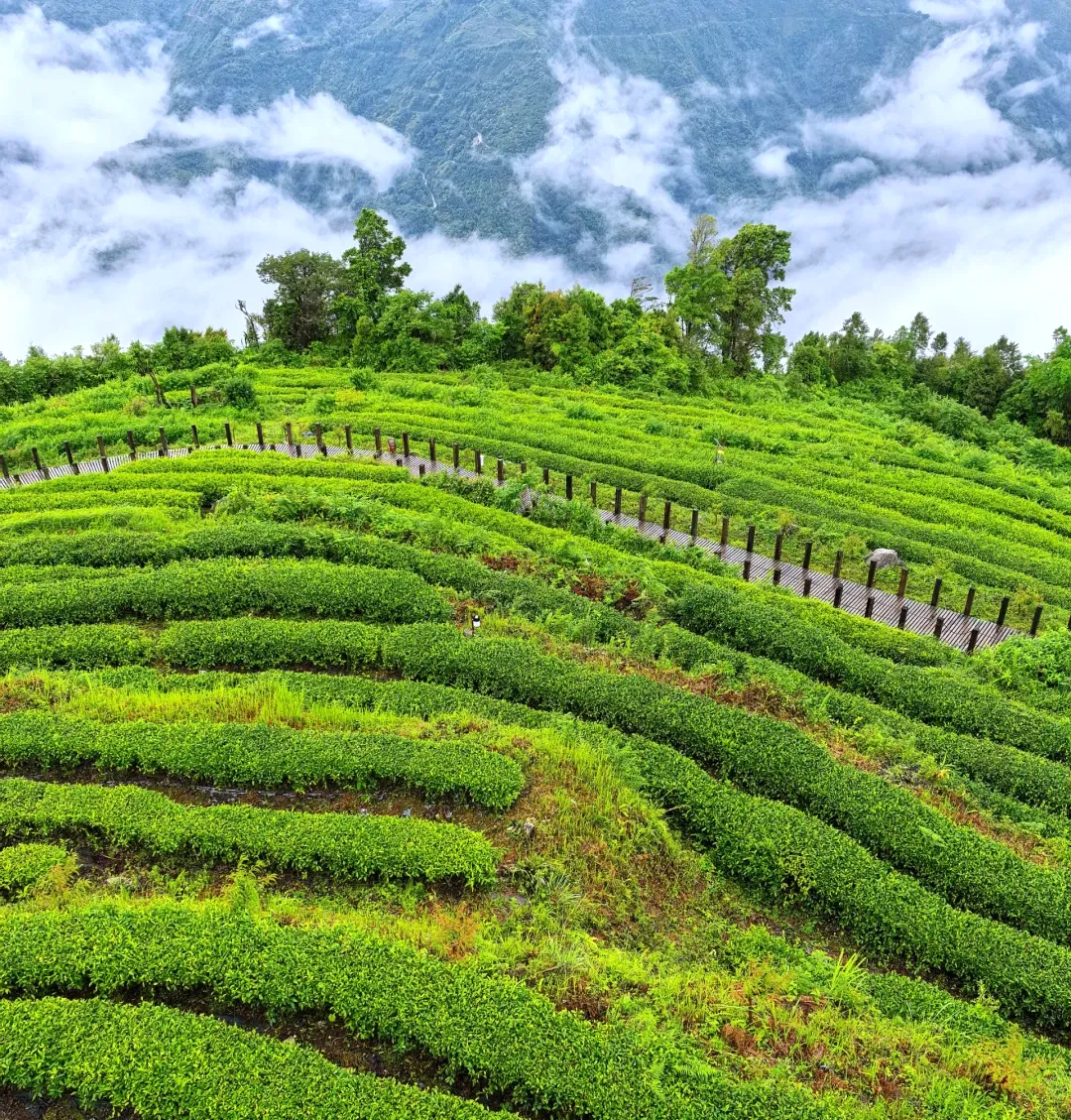 早餐后出发,先来到【格林村】观景台停车场,需要经过一片茶园—【缥缈茶园】,就能登上莲花状的观景台,近处是成片翠绿的茶叶,远处是青蓝的天空和圣洁的云烟,由衷感慨:凡间仙境不过如此。