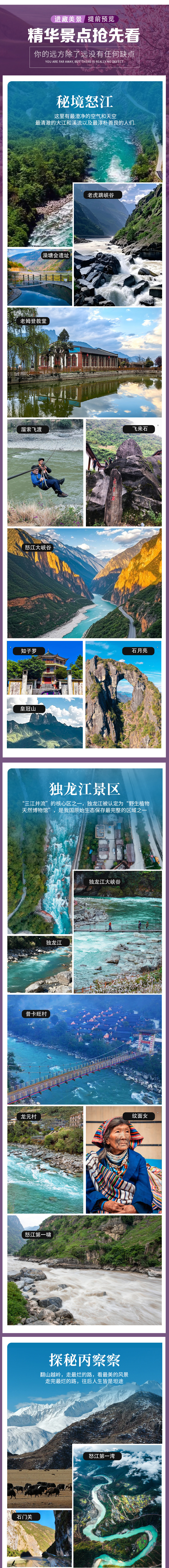游览重点:怒江大峡谷、老姆登晨景、皇冠山、知子罗、石月亮、普卡旺村、龙元村、纹面女
