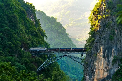 随后沿着国道,途径大片荔枝园后,来到【人字桥村】,我们来一段滇越铁路的【轻徒步体验】,沿着铁轨前行几百米,穿过山洞,近距离的来到桥边,这是800余名中国劳工血泪建成的已经沿用了100多年的的人类奇迹—【人字桥】。运气好,还能看到经过桥上的运输货物的货运火车。看完桥以后就返回下来谷底,沿着峡谷栈道,从另外一个角度还可以看到它的全景风貌。