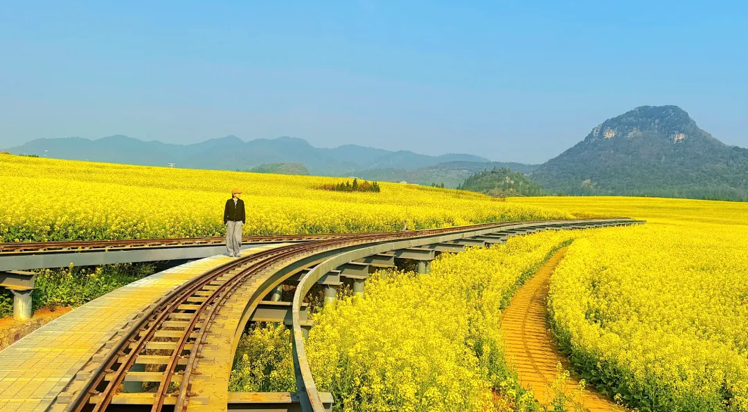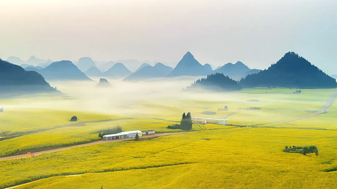 玩后前往罗平【金鸡峰从】,此处地方比较灵活,大家可以分开游玩,金鸡峰可以在附近山头拍照,也可租电瓶车或自行车前往更深入的地方看花海。春天的罗平满眼都是金灿灿的黄,几十万亩油菜花满山遍野地开放,非常充裕的时间留给您尽情拍照,还特意为您准备了特色民族服装让您尽情地放飞自我凹造型!天气好可以拍摄到耶稣光射到云雾中若隐若现的油菜花以及金鸡峰群。日落后我们前往罗平县城入住。