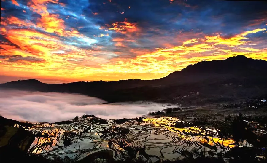 亮点:多依树日出+蓝色梯田+阿者科村蘑菇房+梯田轻徒步+屏边大围山,自然与人文结合!