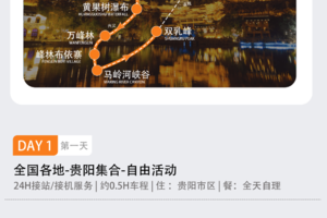 大家根据出发地的高铁动车/航班时间抵达贵阳龙洞堡机场贵阳北站贵阳东站贵阳站】。我们提供24小时接机/接站服务,车次时间不限,随到随接,早到早玩。